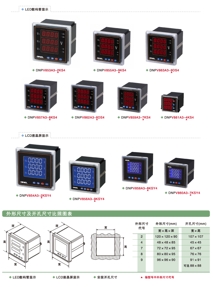 DNPV 853A3~863A3 測量:三相電壓 顯示方式: ● 三排LED數(shù)碼管顯示 ● 高清LCD液晶屏顯示 符合標(biāo)準(zhǔn):GB/T22264.1, GB/T13978. |